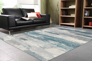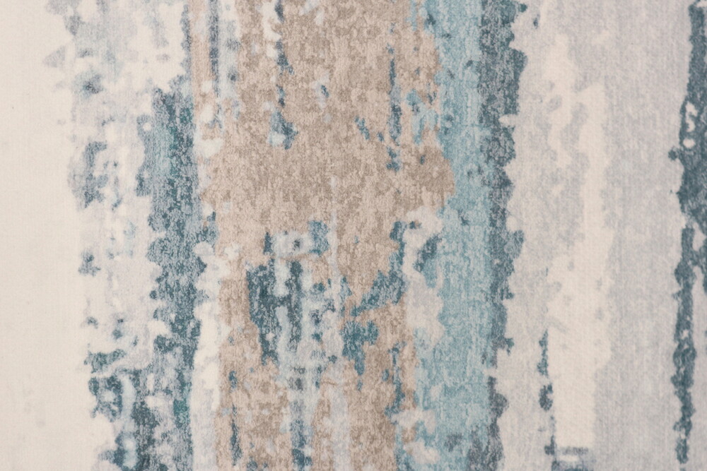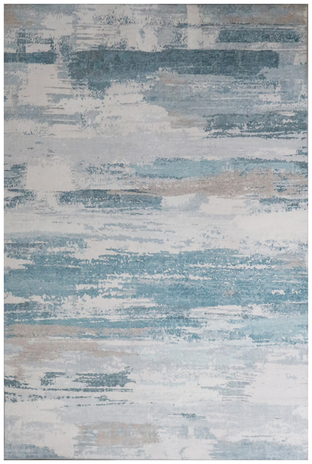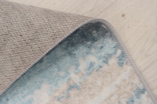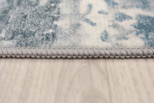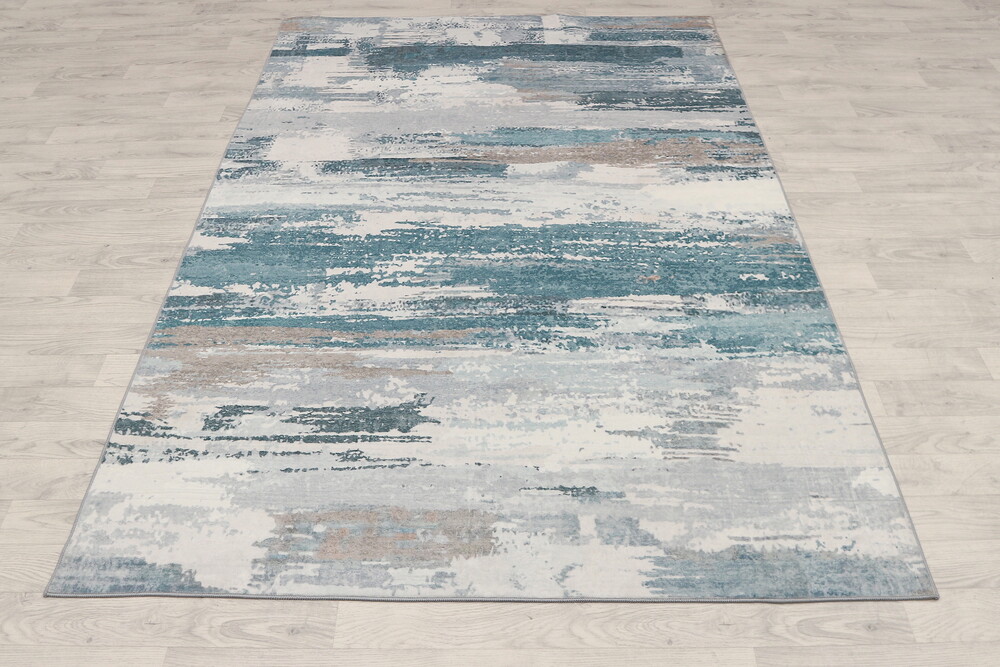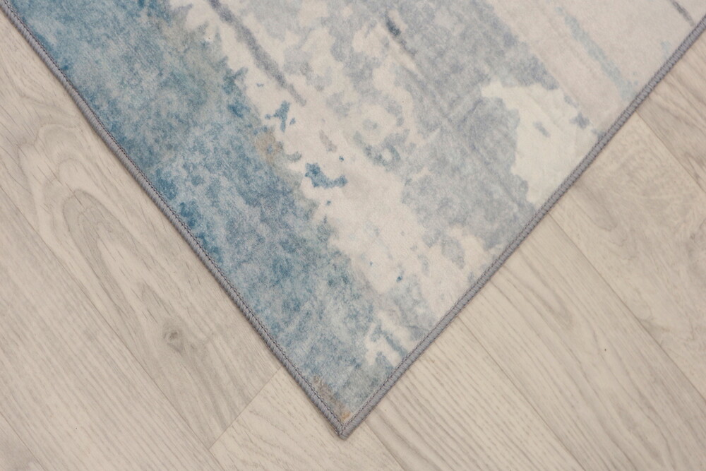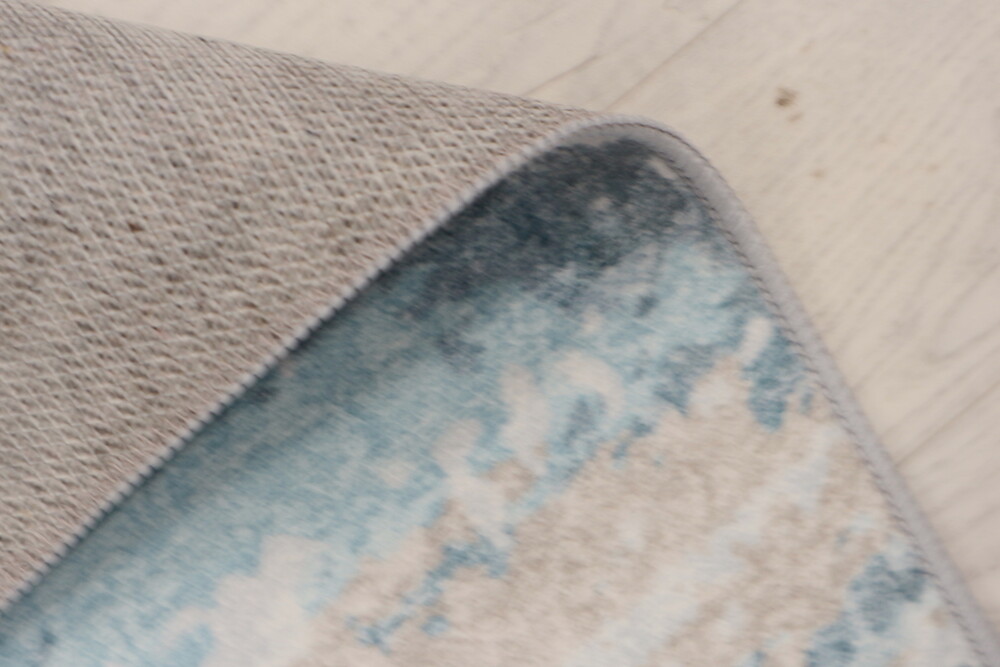 Washable , rubber backed rug that can go in the washing machine on a cold cycle with a mild detergent.Dry flat or on a cool dryer cycle.Machine woven rug from China.Rubber backed so no need for anti slip underlay.Manufacturers describe the colour as sky.