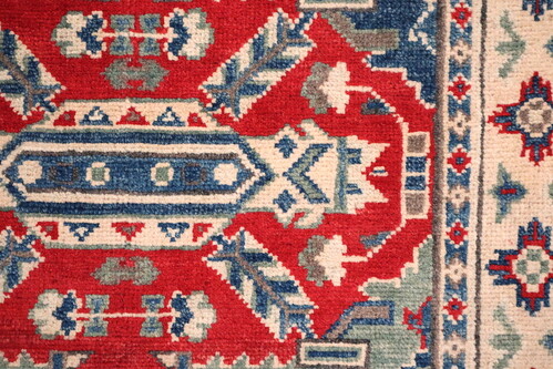 Afghan Kaynak rugs are based on centuries old styles and designs. Using mainly bigger and bolder designs and using the colours of Red, Dark Blue and Cream these striking rugs work well at brightening up dark rooms.