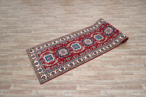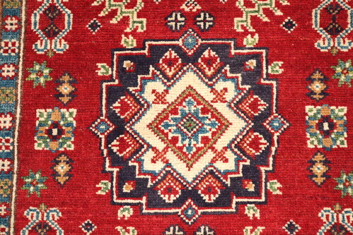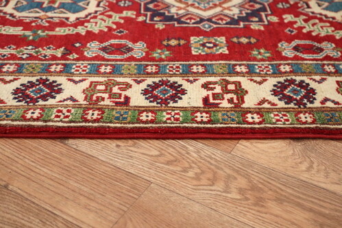 *Please note there is some dye run on the edge of this rug , barely noticeable * Afghan Kaynak rugs are based on centuries old styles and designs. Using mainly bigger and bolder designs and using the colours of Red, Dark Blue and Cream these striking rugs work well at brightening up dark rooms.