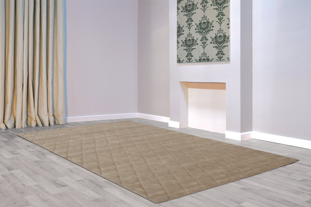 Hand made 100% wool rug. Sculpted pile, Colour for this rug is classed as Taupe by suppliers.