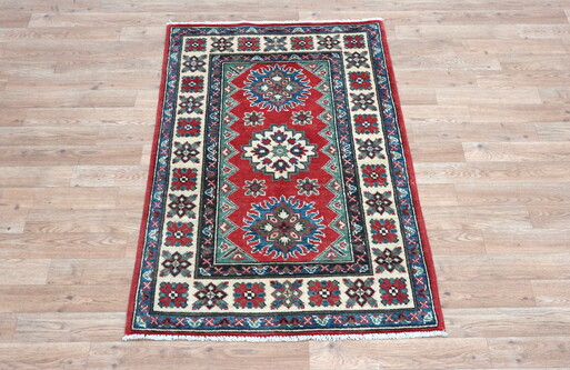 Afghan Kaynak rugs are based on centuries old styles and designs. Using mainly bigger and bolder designs and using the colours of Red, Dark Blue and Cream these striking rugs work well at brightening up dark rooms.
