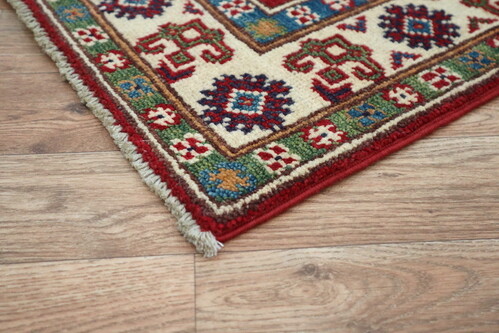 *Please note there is some dye run on the edge of this rug , barely noticeable * Afghan Kaynak rugs are based on centuries old styles and designs. Using mainly bigger and bolder designs and using the colours of Red, Dark Blue and Cream these striking rugs work well at brightening up dark rooms.